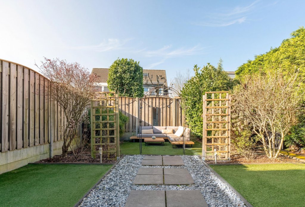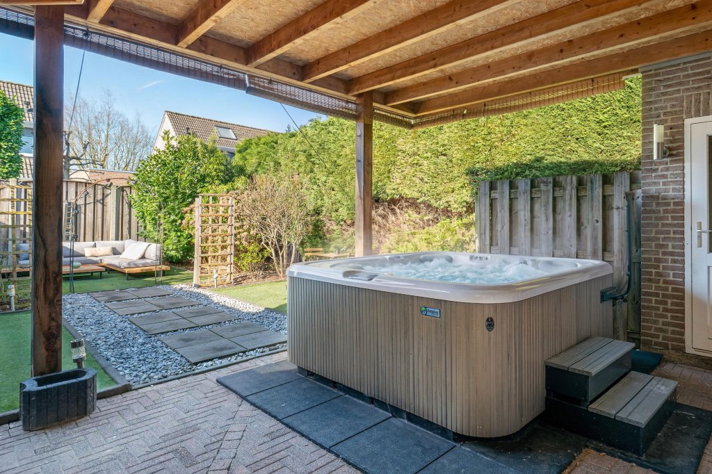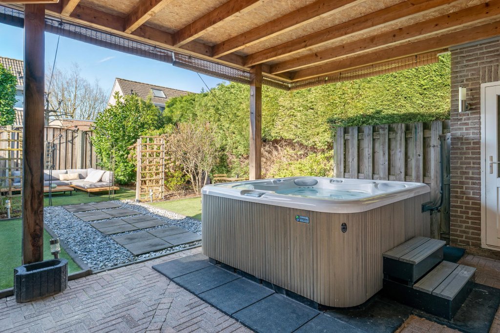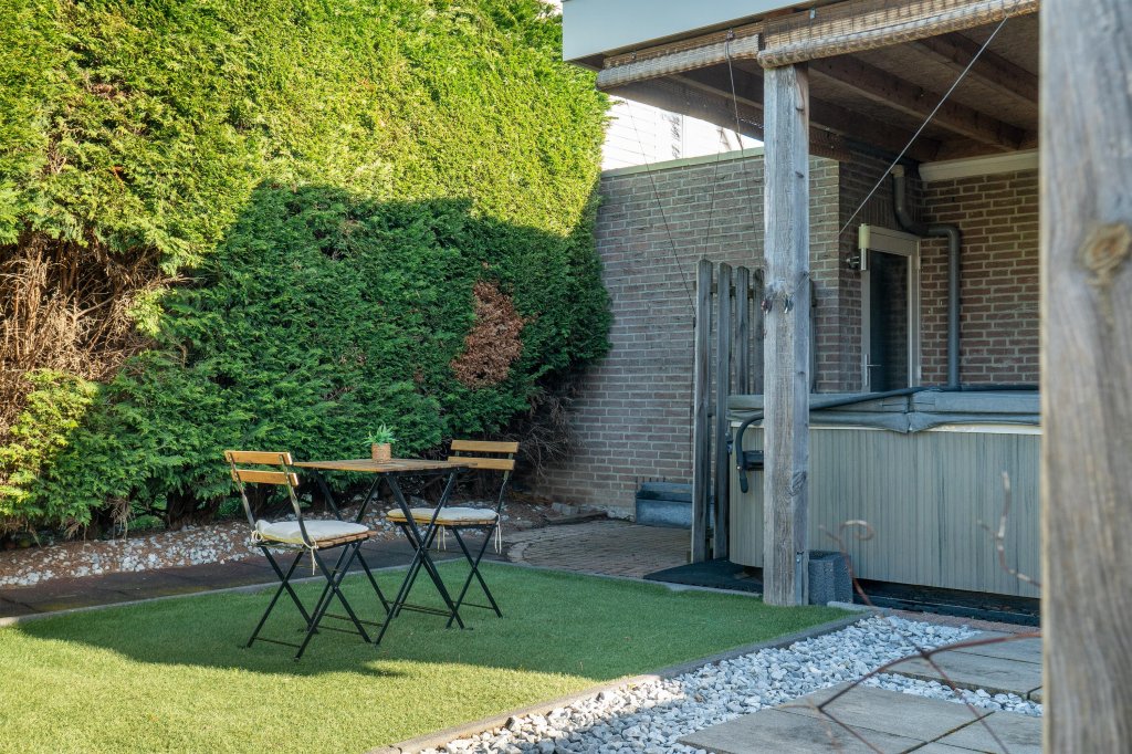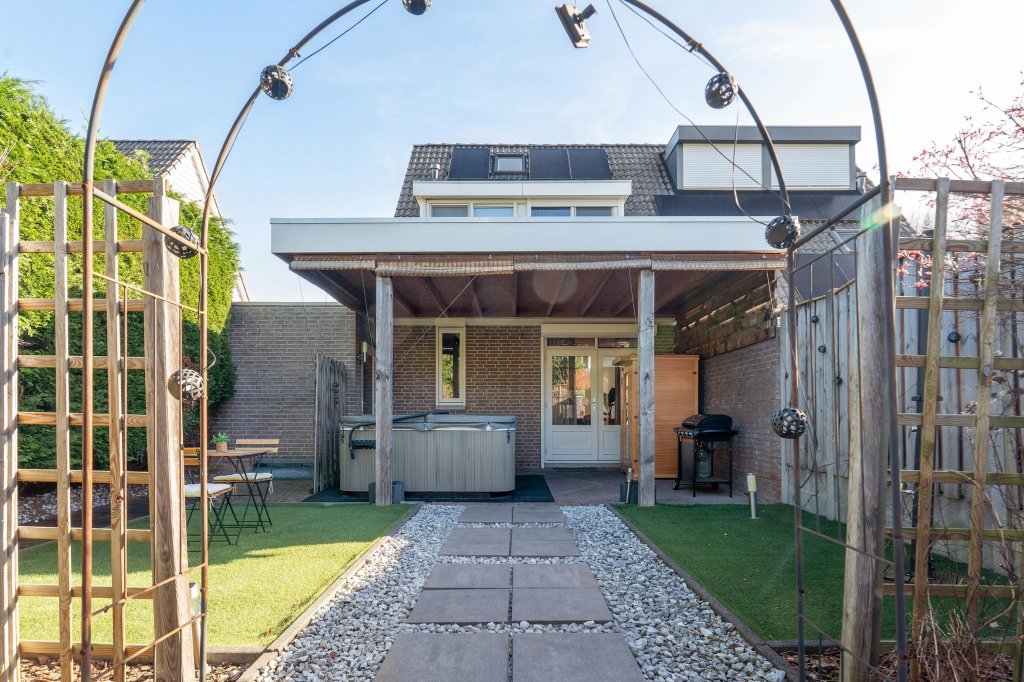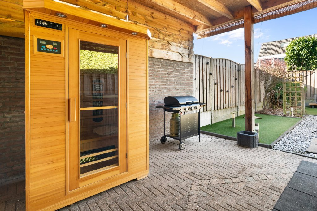 Via openslaande deuren vanuit woonkamer en loopdeur vanuit garage te bereiken geheel omsloten, onderhoudsvrije achtertuin met kunstgras en royale terrasoverkapping. De tuin beschikt over een uitstekende bezonning (zuidwesten) en privacy. Garage: Naast woonhuis gelegen garage met elektrisch bedienbare kantelpoort met loopdeur naar oprit.