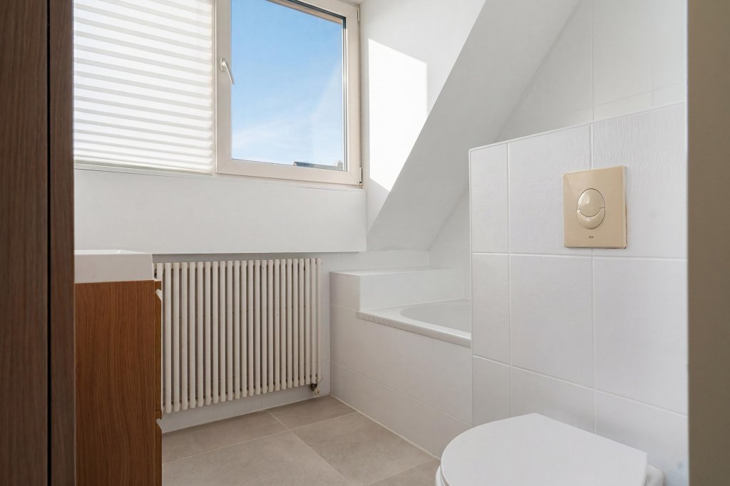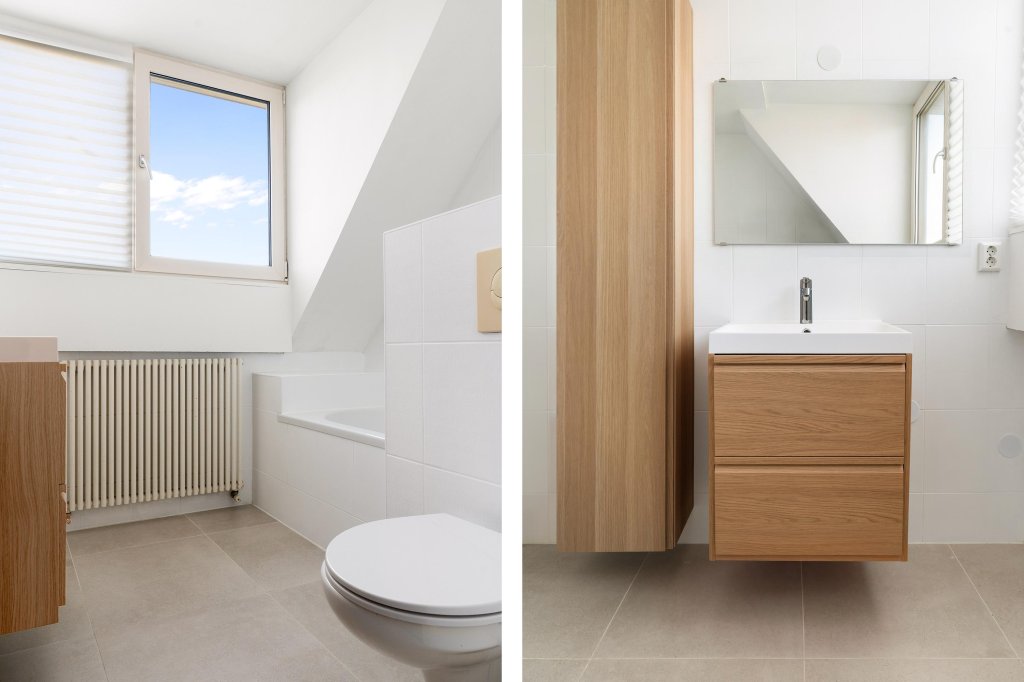 Overloop met toegang tot twee slaapkamers (Voormalig 2 slaapkamers) en geheel betegelde badkamer met douche/ligbadcombinatie, 2e toilet, badmeubel.