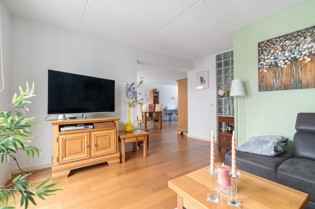 De lichte en sfeervolle woonkamer met eetgedeelte is voorzien van een parketvloer en biedt direct toegang tot de achtertuin. De open keuken in hoekopstelling is compleet uitgerust met diverse inbouwapparatuur, waaronder een oven/magnetron, inductiekookplaat, afzuigkap en koelkast. Via de keuken is de praktische trapkast te bereiken.