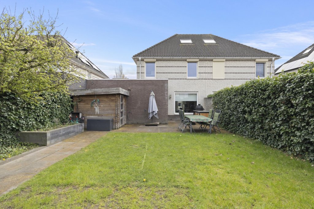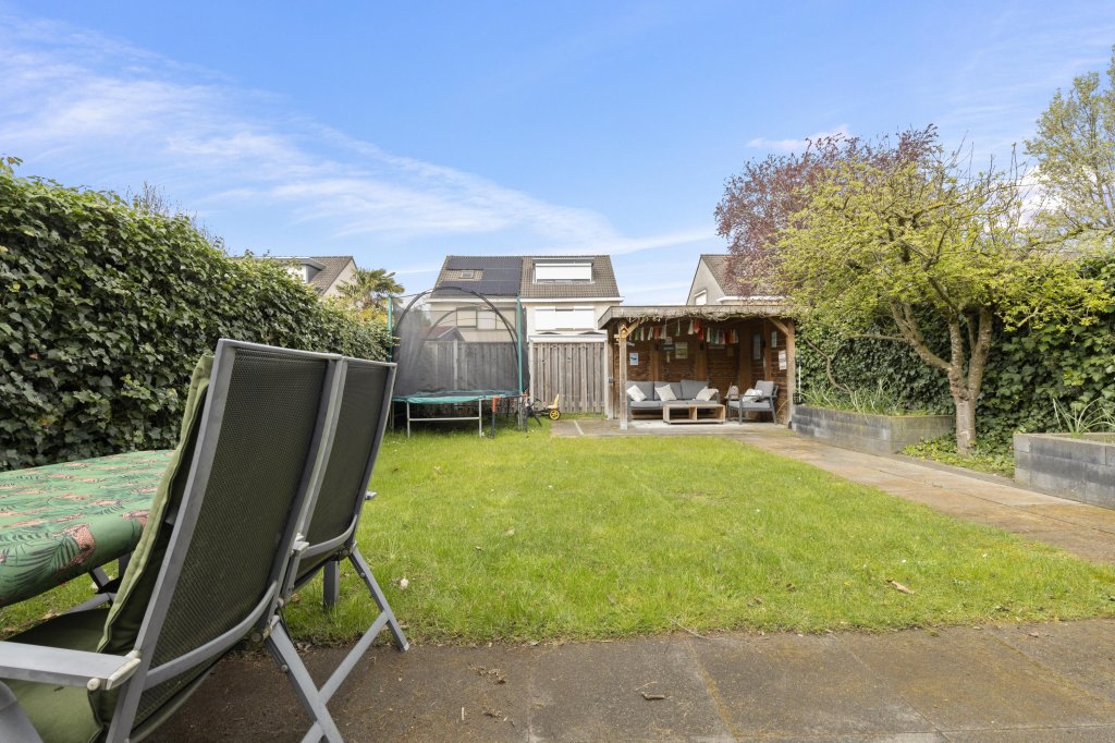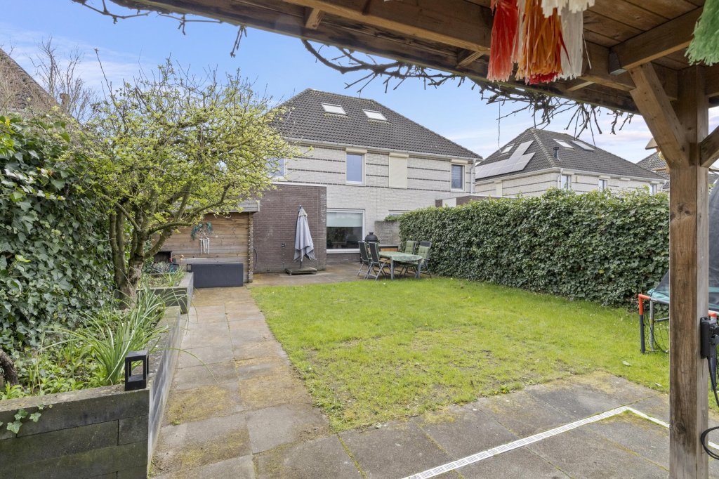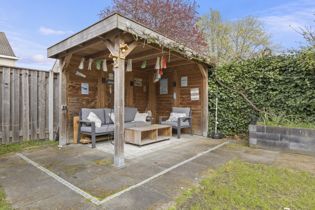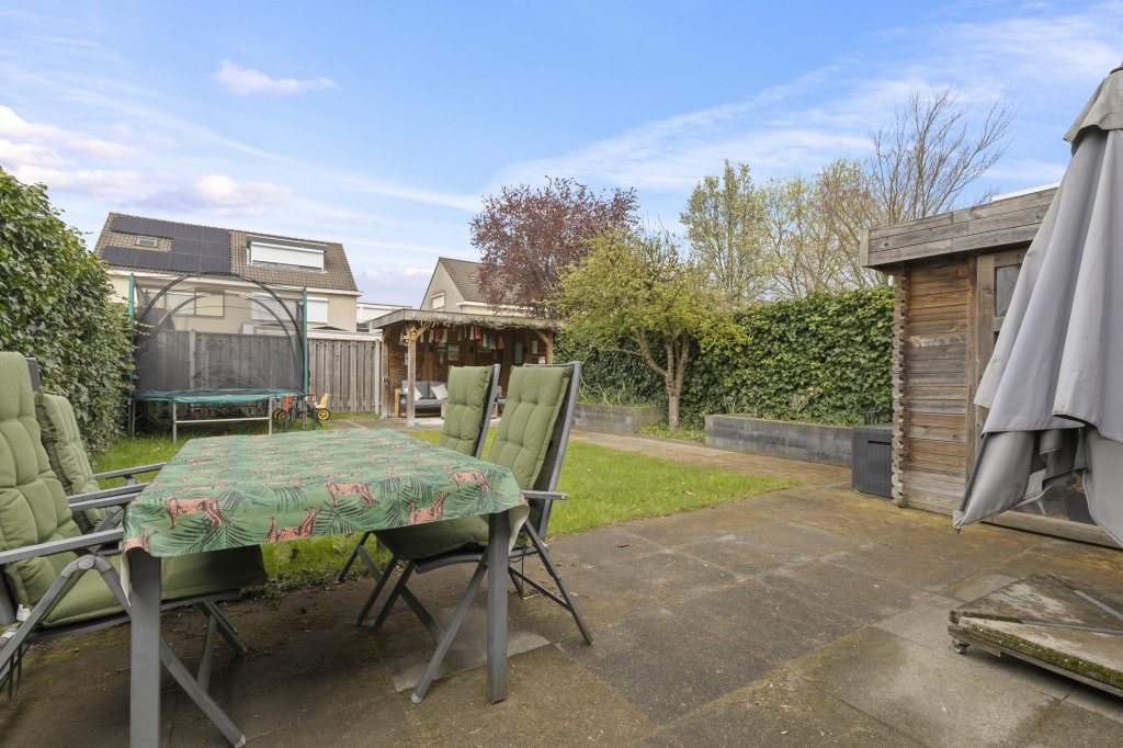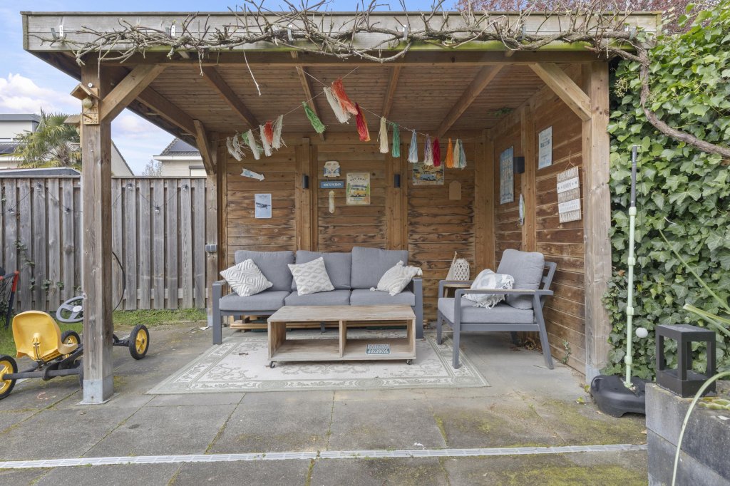 De verzorgde achtertuin is van alle gemakken voorzien. Onder de sfeervolle terrasoverkapping is het heerlijk ontspannen, borrelen of lang tafelen met familie en vrienden. De tuin beschikt daarnaast over een houten tuinberging, terras, gazon en borders.