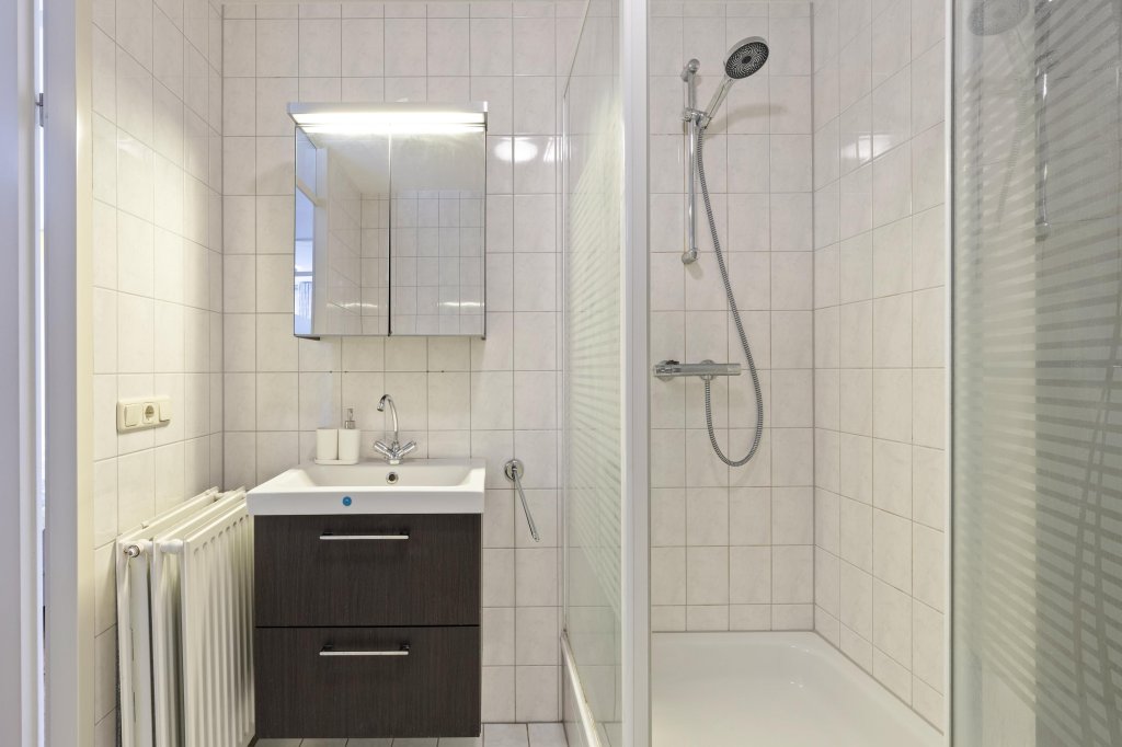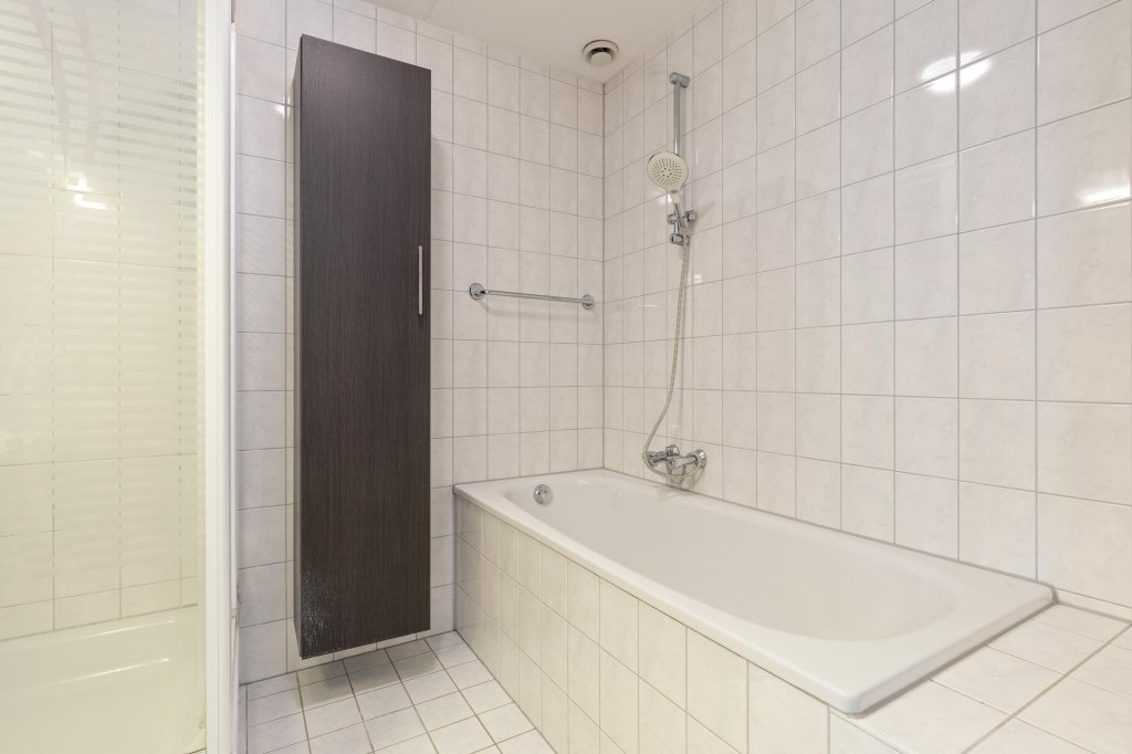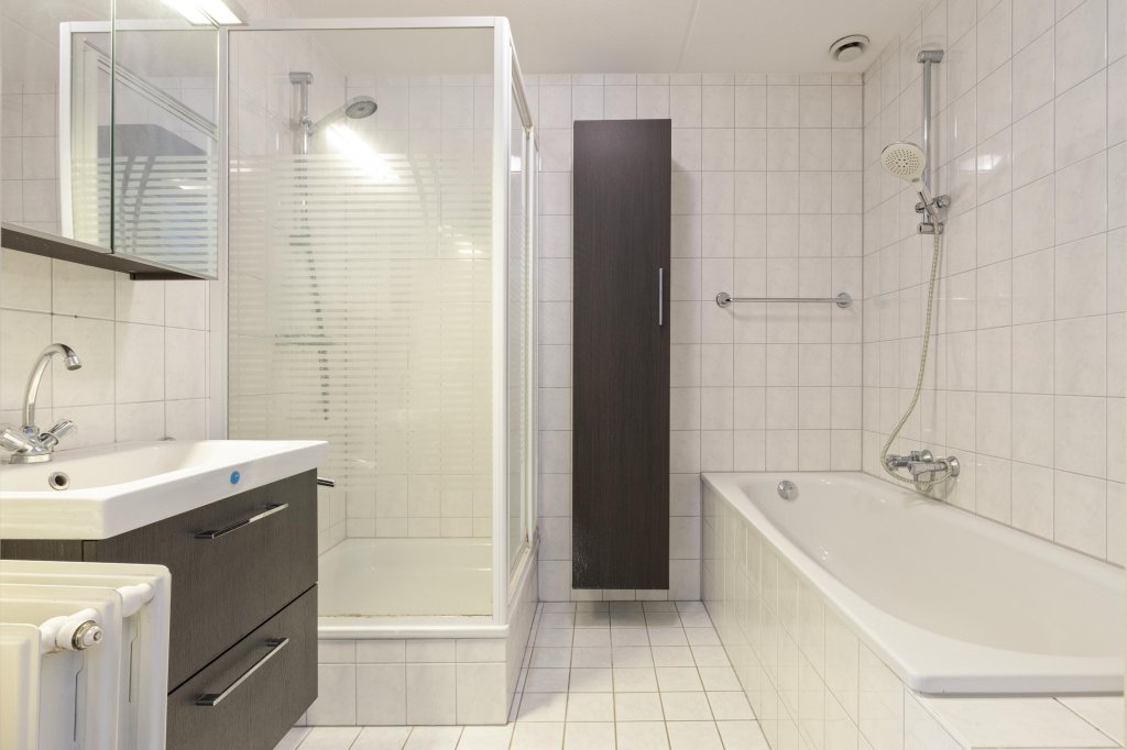 De badkamer beschikt over een ligbad, douche en wastafel met meubel.