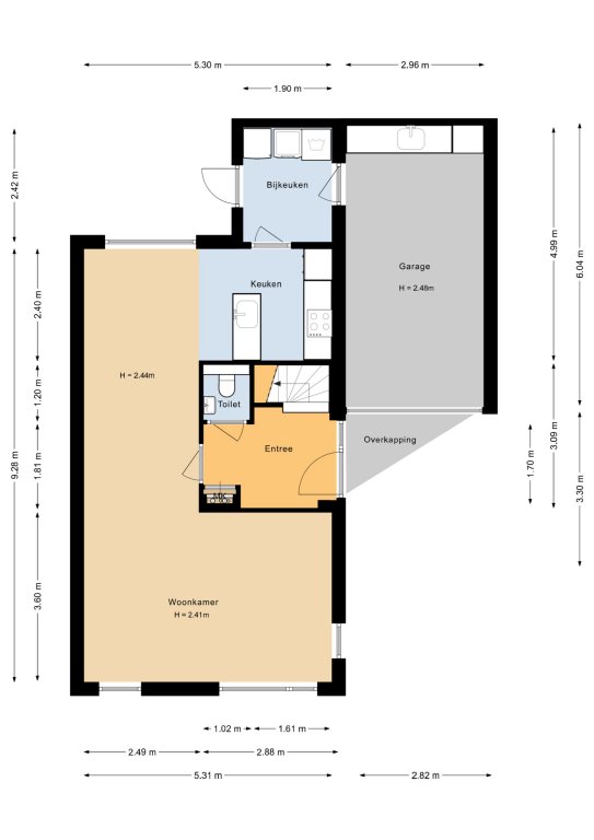 De garage is voorzien van een elektrisch bedienbare poort en biedt volop ruimte voor opslag of het stallen van een voertuig. Voor de garage bevindt zich een ruime oprit en is er voldoende openbare parkeergelegenheid.