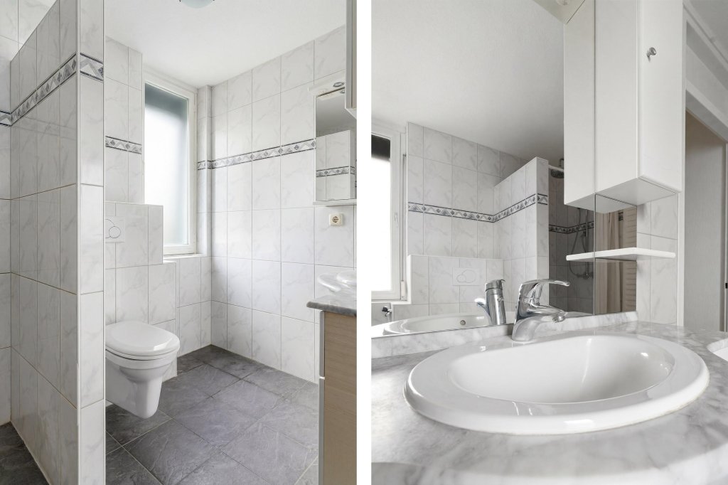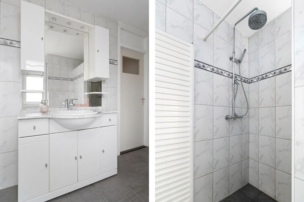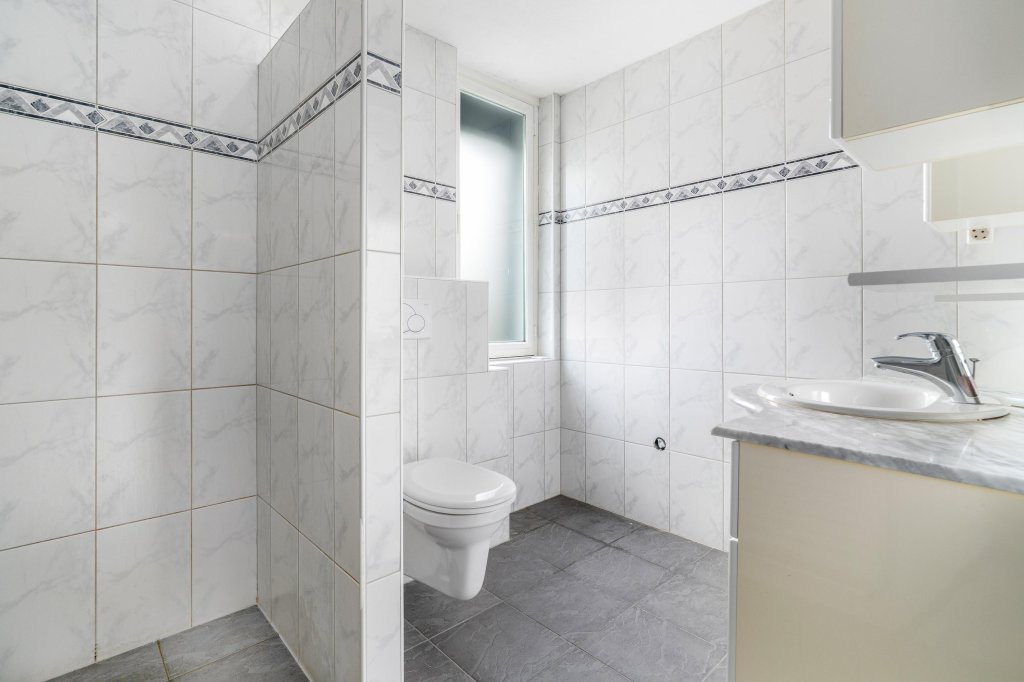 De badkamer beschikt over een inloopdouche, toilet, wastafel met meubel en wasmachineaansluiting.