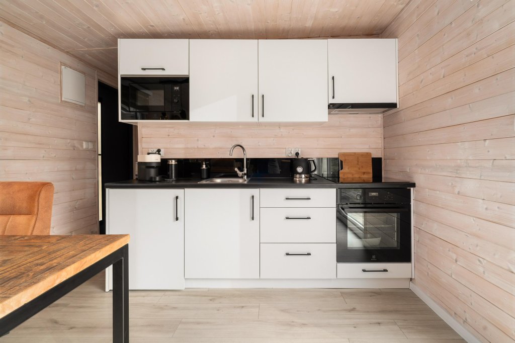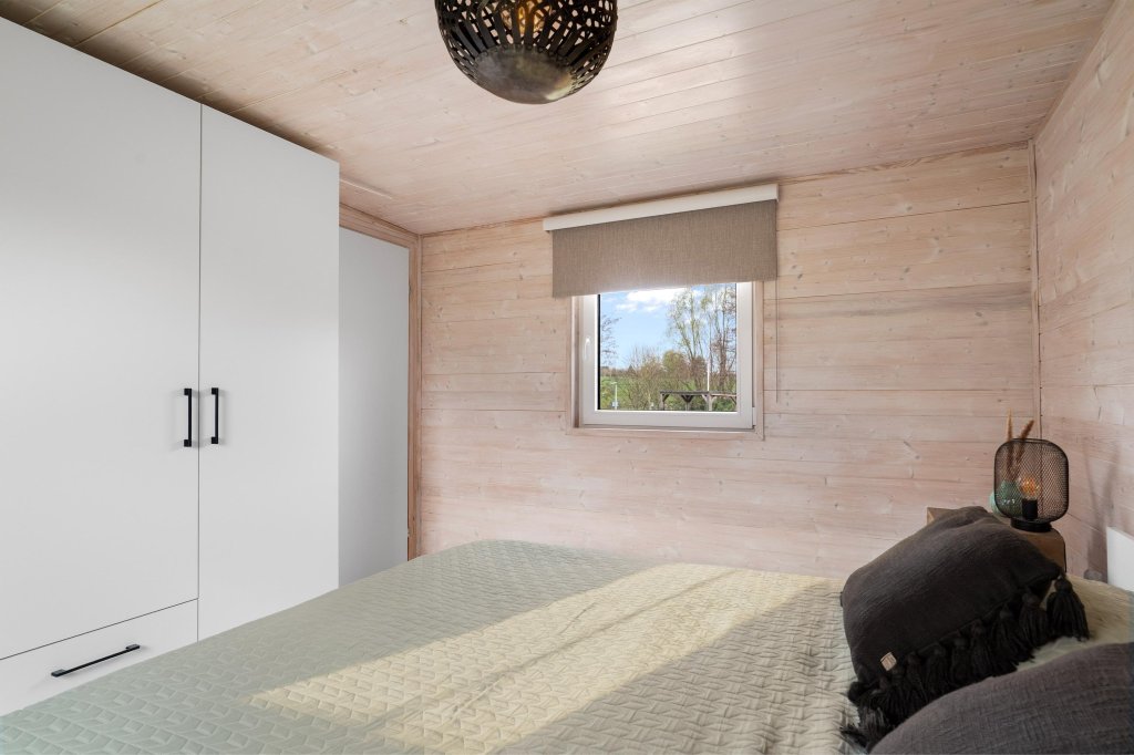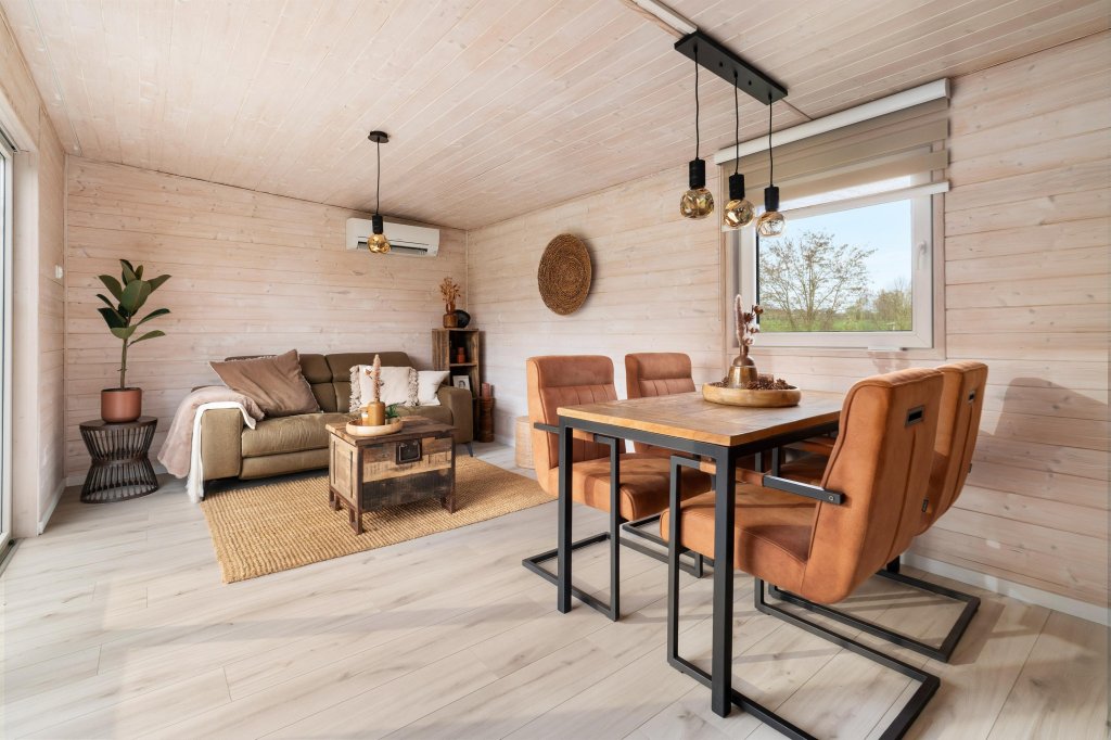 Dit verzorgd afgewerkte Tiny house combineert slim ruimtegebruik met comfortabel wonen. De woning beschikt over een totale oppervlakte van ca. 34 m² ingedeeld in een lichte woonkamer met airconditioning en een grote schuifpui, waardoor binnen en buiten naadloos in elkaar overlopen. De moderne open keuken met vaatwasser, 4-pits inductiekookplaat, afzuigkap en koelkast, sluit hier perfect op aan en zorgt voor een ruimtelijk geheel.